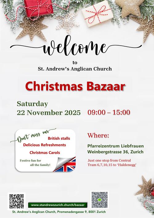 The annual St Andrew’s Christmas Bazaar is back this year at the Pfarreizentrum Liebfrauen with Handmade crafts, jams and marmalade, British groceries, Christmas gifts, Children’s Toys, Used English books, and so much more!